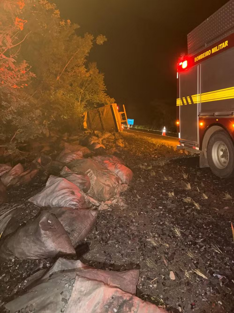 A carga de carvão ficou espalhada fora da pista, mas, segundo as autoridades, não houve necessidade de interdição da rodovia.