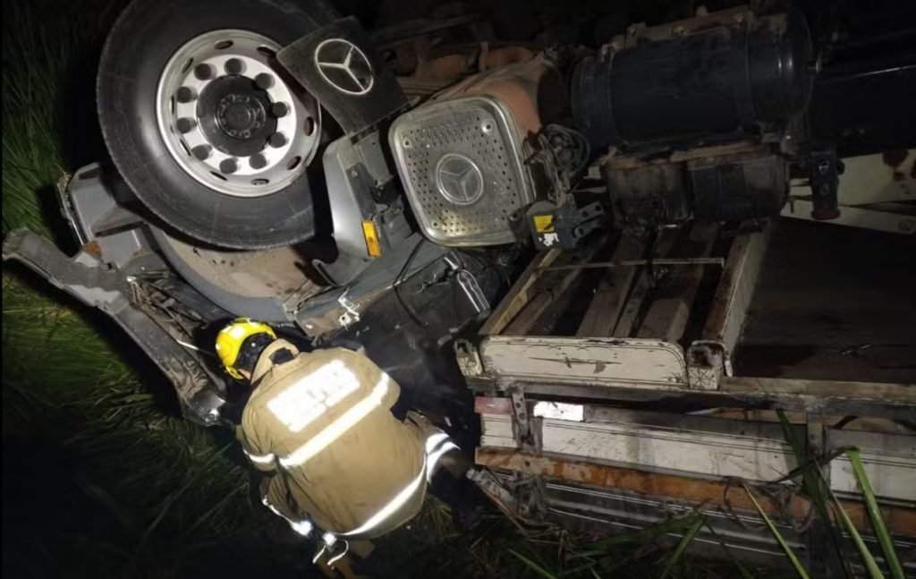De acordo com o Corpo de Bombeiros, ao chegar no local, a equipe encontrou o veículo tombado próximo à rodovia, no KM 448. A carreta estava transportando uma carga mista de borracha e cartuchos de resina.