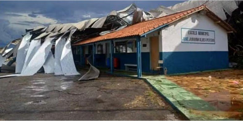 A instituição foi afetada na sexta (1º) após a estrutura metálica que cobre a quadra escolar ceder com a força do vento e atingir parte do imóvel. Apesar do susto, os professores já tinham deixado o prédio após a reunião do dia escolar.