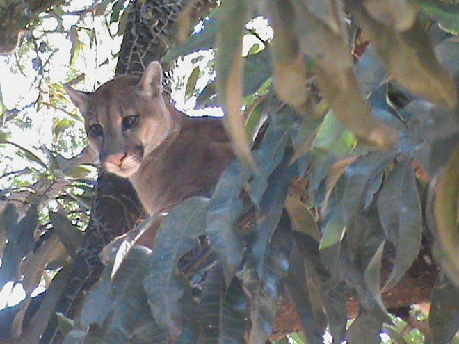 Um filhote de onça, aparentemente uma jaguatirica, foi encontrado por moradores em cima de um pé de manga, numa chácara conhecida como “Ninho da Coruja”, no bairro Jardim Liberdade.