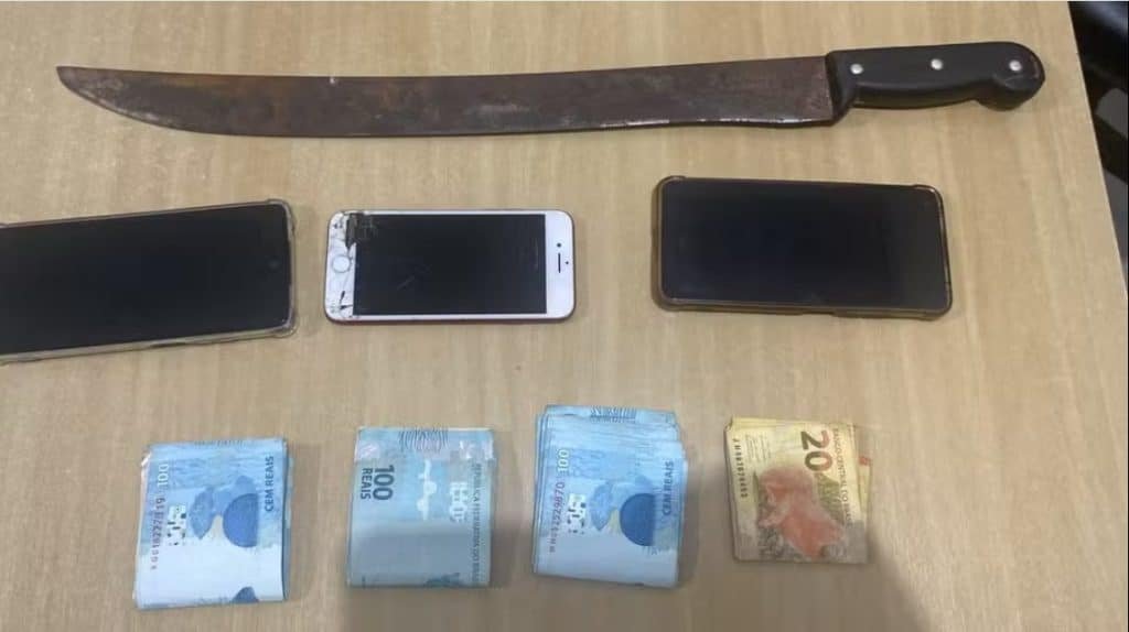 Durante as buscas, parte do dinheiro roubado foi retirado pelos militares e eles apreenderam o facão usado para ameaçar a vítima.