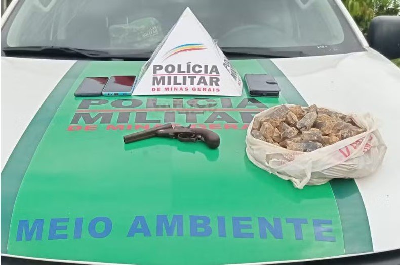 Ao ver a polícia, os mineradores correram em diversas direções , mas foram alcançados. Foram apreendidos vários sacos de fios de nylon contendo quartzo, uma mochila com celulares, picaretas, pás, uma bucha de maconha e outra mochila contendo uma arma de fogo e um pino de cocaína.