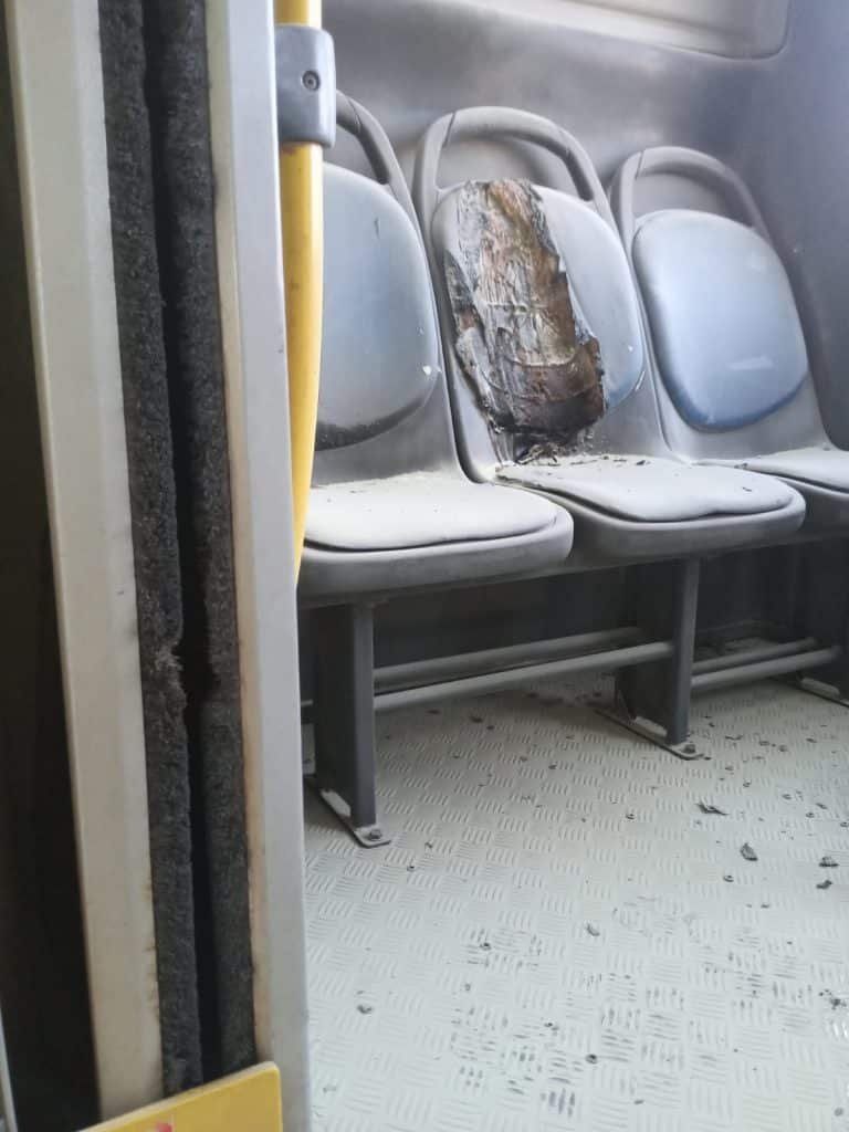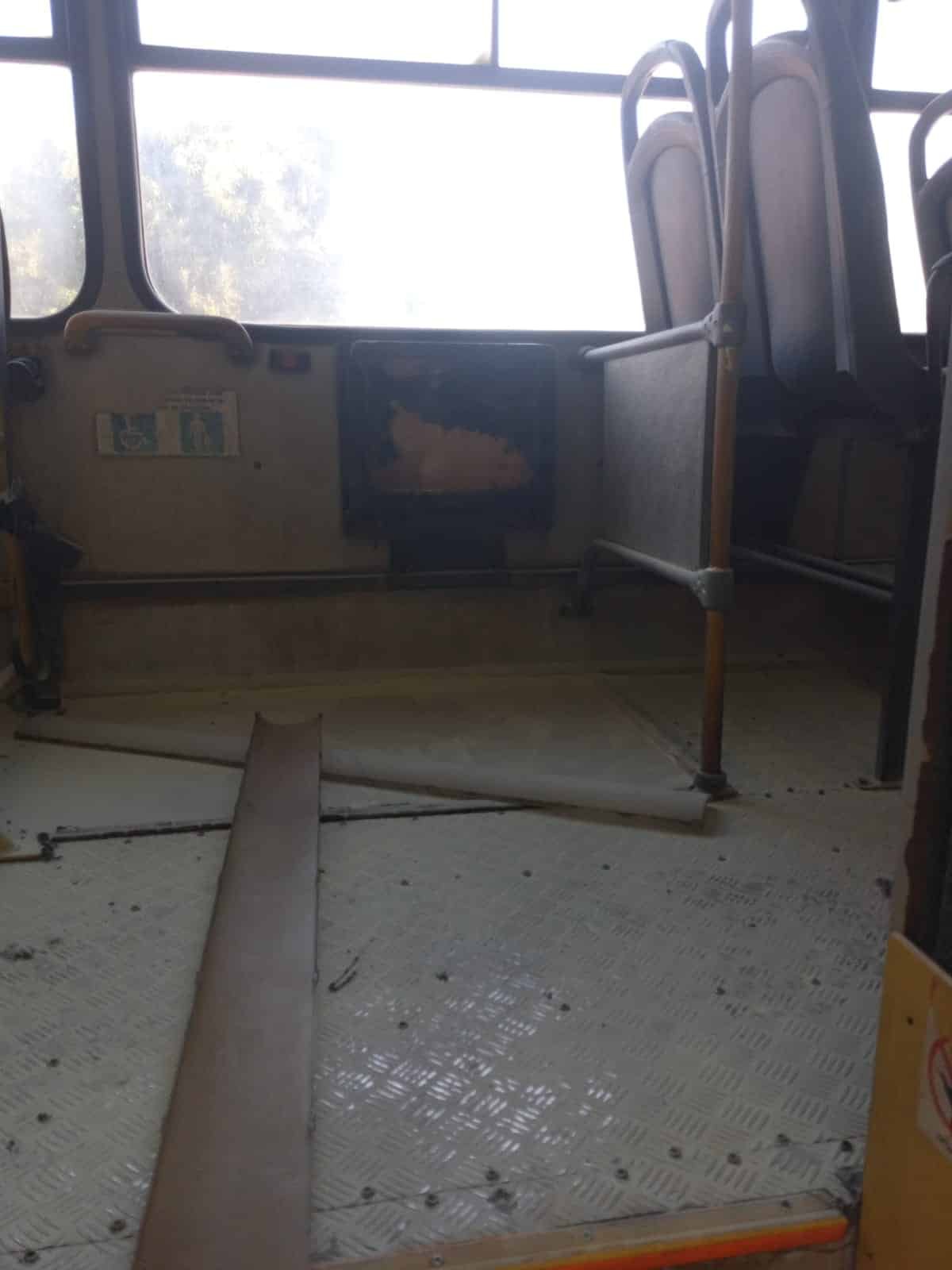 O teto e algumas poltronas do ônibus ficaram danificados. Um motorista que passava pelo local pegou o extintor e conseguiu conter as chamas, antes que elas se alastrassem.