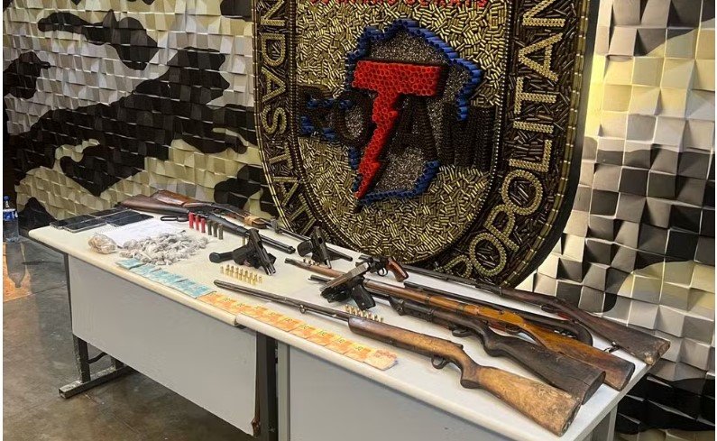 Foram apreendidos um revólver calibre 38, duas pistolas, munição, drogas e R$ 4 mil, além de um caderno de anotações de contabilidade de tráfico e celulares.