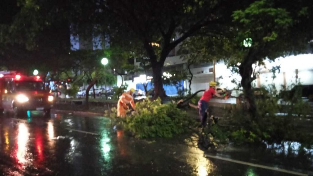 Na avenida João Luiz (foto), centro, ocorreu uma queda de árvore, obstruindo parcialmente a pista de rolamento e, consequentemente, colocando em risco os condutores de veículos.