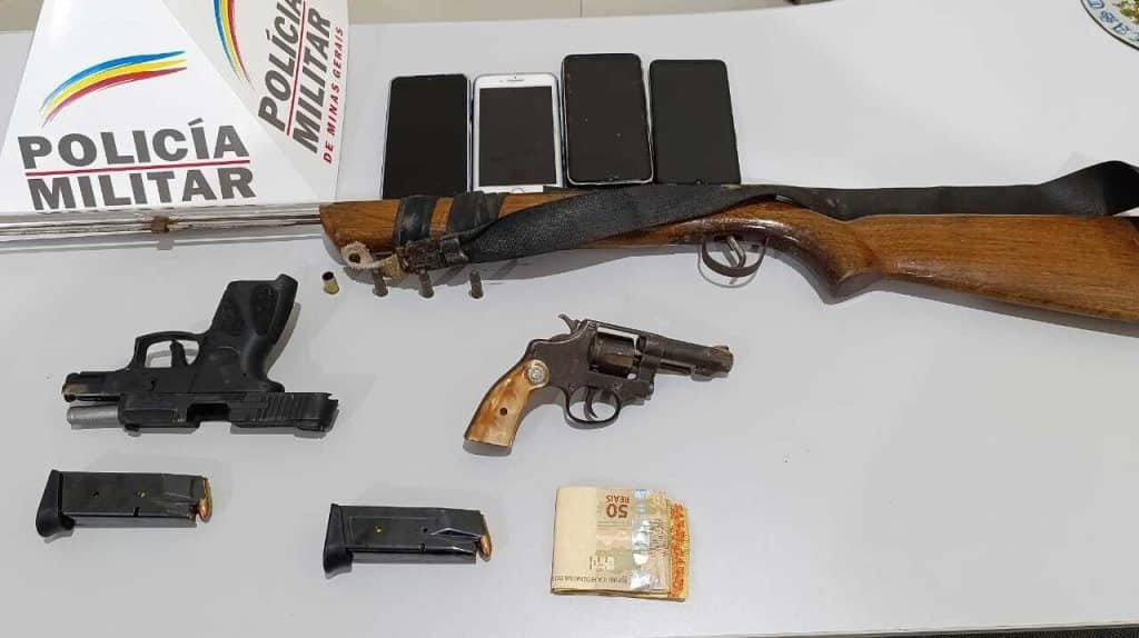 Foram apreendidas três armas de fogo e localizados uma mala contendo explosivos.