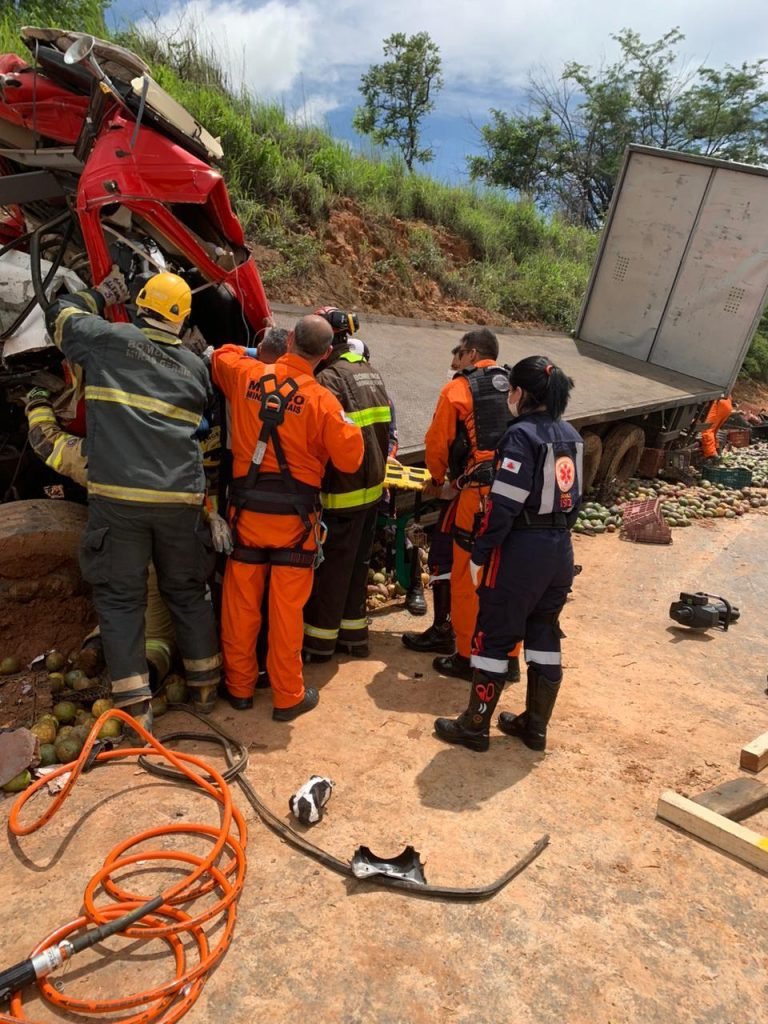 Com o impacto, o passageiro de um dos caminhões ficou preso às ferragens e faleceu no local. Já o motorista do veículo de 24 anos foi socorrido pelo SAMU apresentando fratura de tíbia e fêmur.